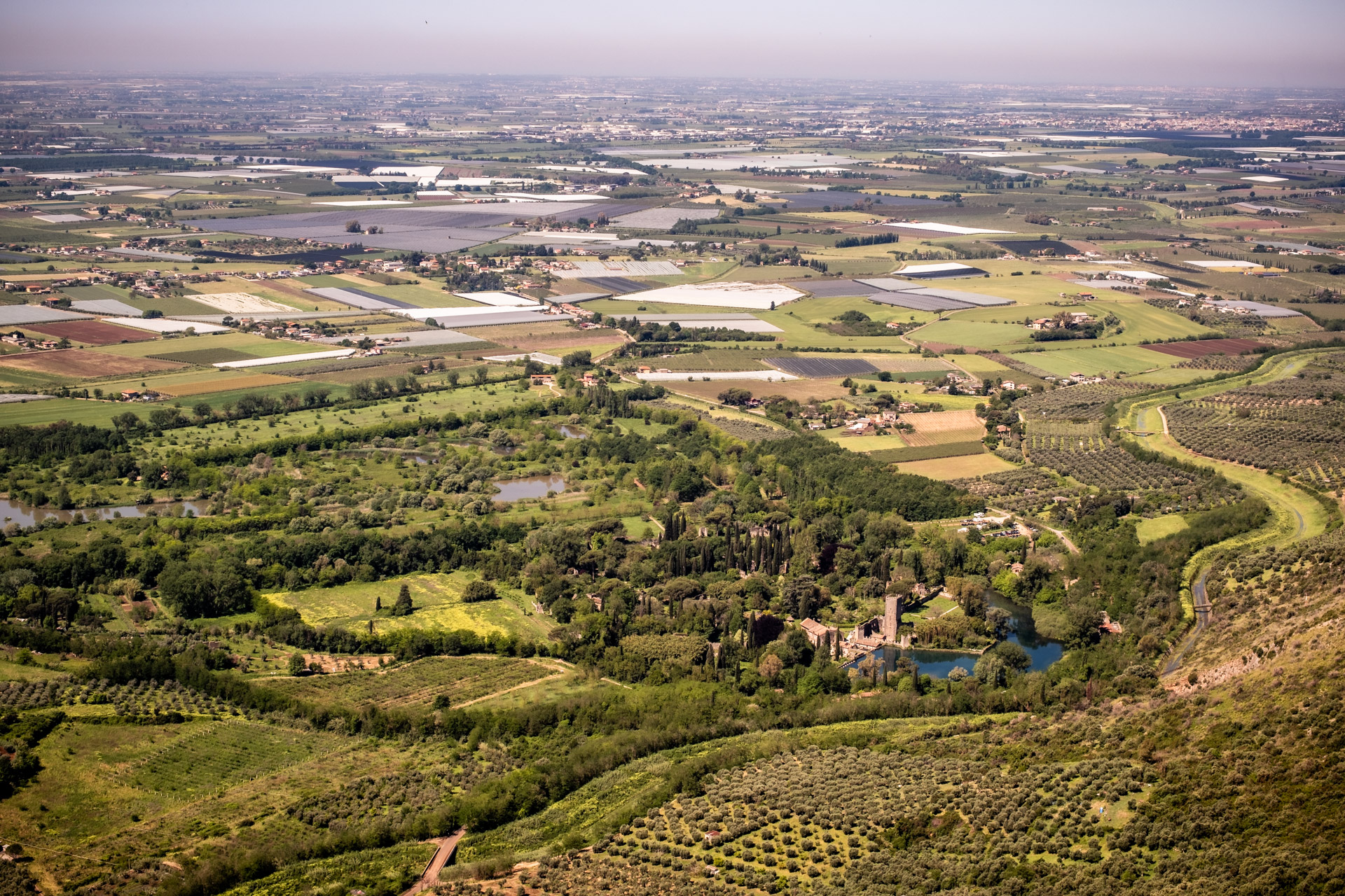 Das erste Bild zeigt einen Blick aus der Vogelperspektive auf die Landschaft. Man sieht unten rechts die Türme und auch den Teich, den man bereits vor dem Betreten sehen kann. Das Besondere ist, dass dieser Garten in der Manier Englischer Gärten in den Ruinen eines bereits zur Römischen Zeit existierenden Dorfs Ninfa angelegt wurde. Über die Entstehung kann man hier etwas lesen.