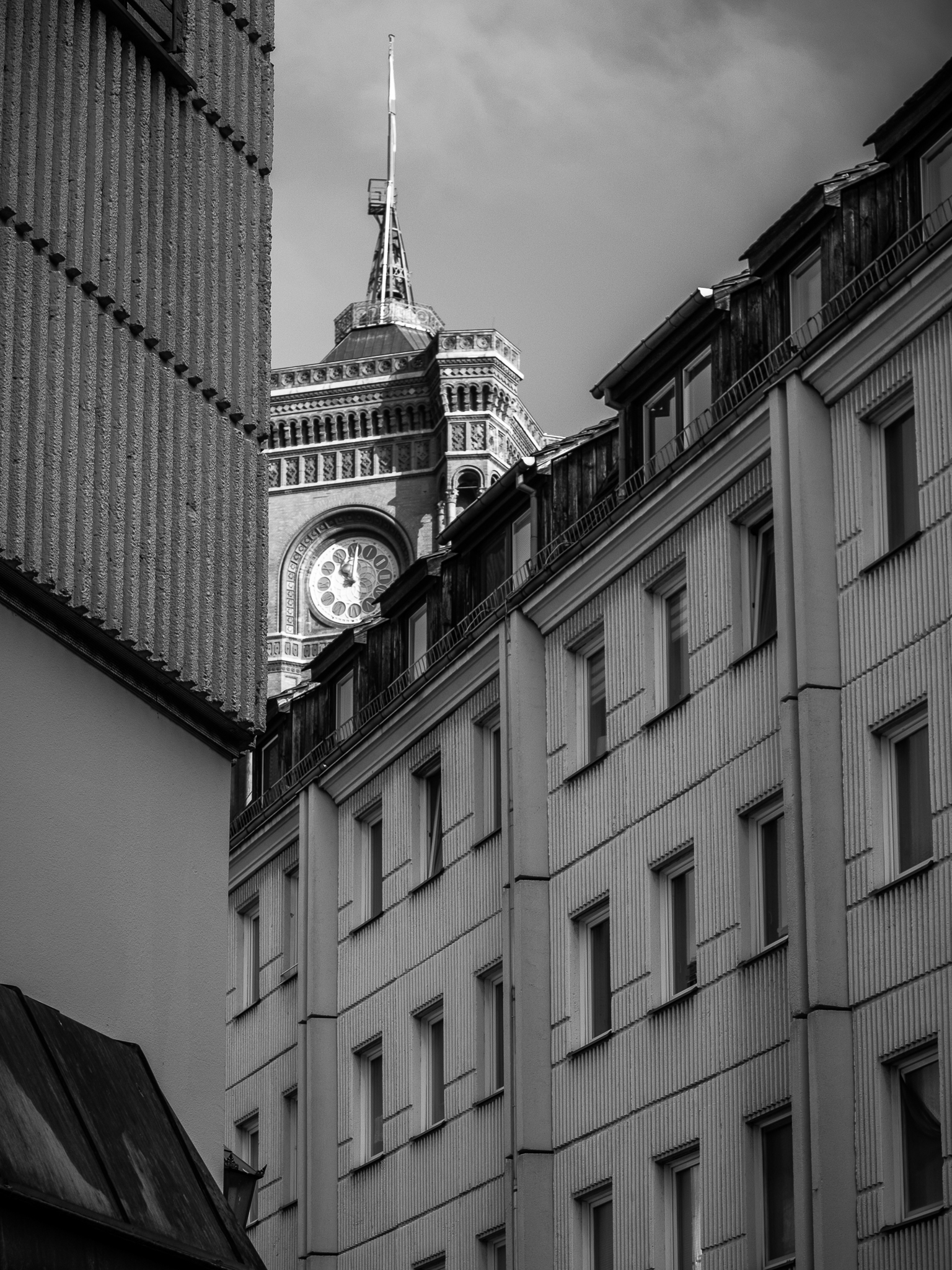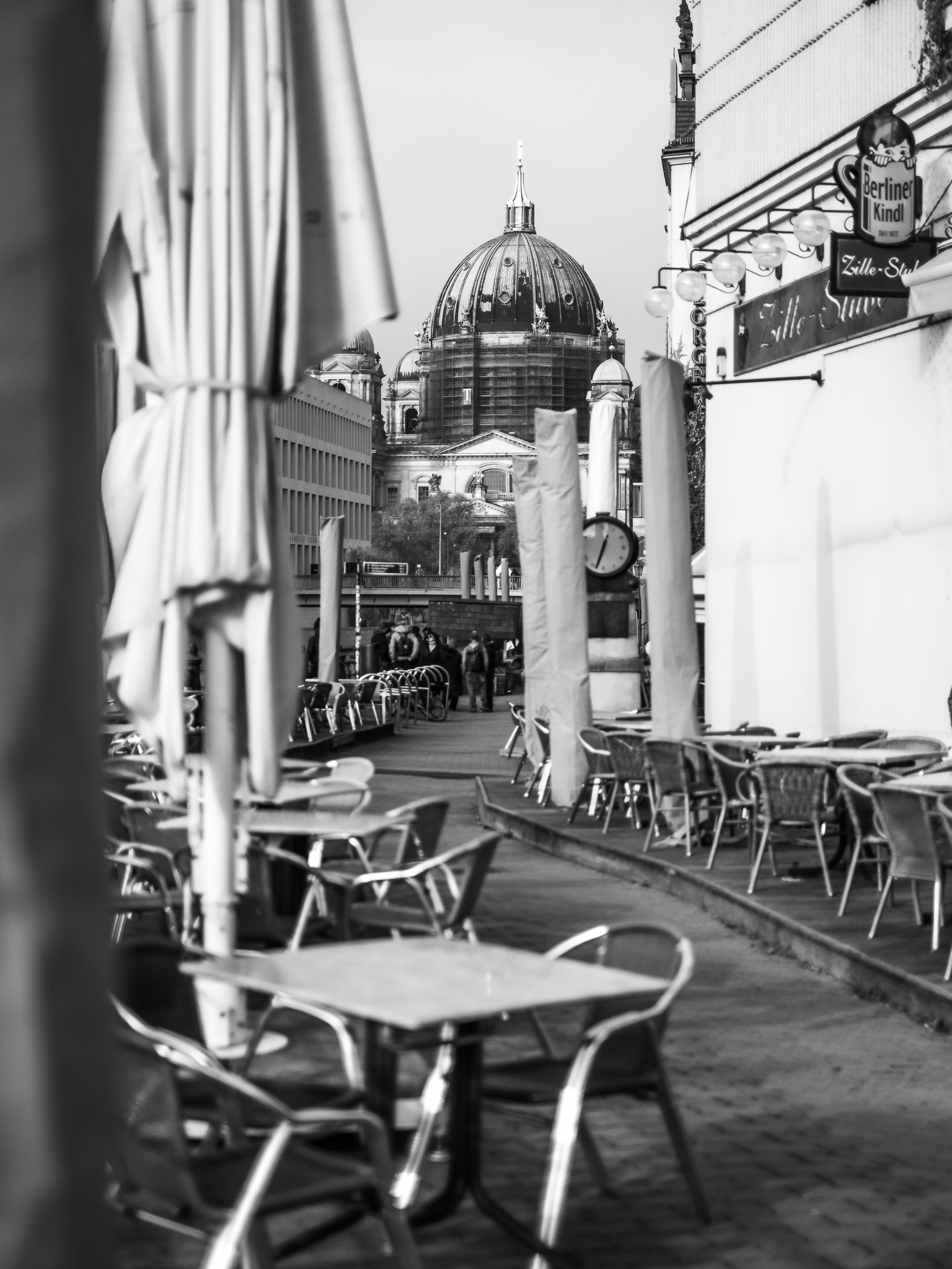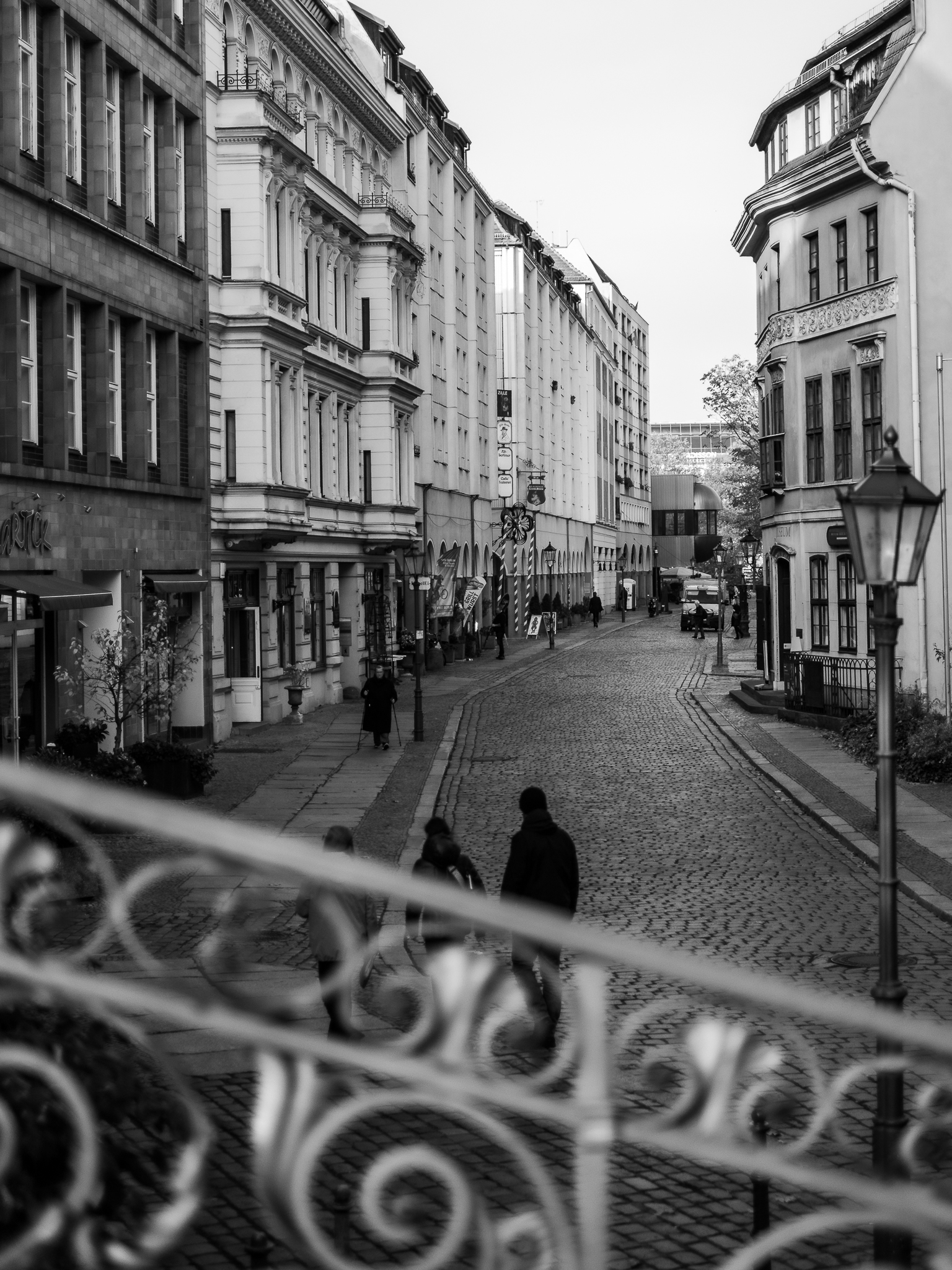 In der Mitte der Stadt, nicht geografisch (die ist hier: N52° 30′ 10,4, E13° 24′ 15,1), aber für mich gefühlt, liegt das Nikolaiviertel. Begrenzt vom Roten Rathaus, dem Marx-Engels-Forum, der Leipziger Straße und der Spree findet man ein Areal in dem sich Plattenbauten und alte Fassaden um die älteste Kirche Berlins gruppieren. Läuft man durch die verkehrtsbefreiten Straßen hat man immer die hohen grünen Türme der Nikolaikirche, den Berliner Dom, den Fernsehturm oder das Rote Rathaus im Blick.